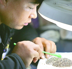 研究人員在對(duì)篩選水洗探方土樣后殘留的微小物質(zhì)進(jìn)行挑選。李鵬攝/光明圖片