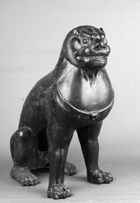 塔頂?shù)奶拼探疸~獅,蹲高50厘米,身長83厘米。蹲坐,昂首,前腿直立,頸有項(xiàng)圈,雙目圓睜、炯炯有神。張口,小耳,尾上翹,空腹,脊部有一長方形孔。造型兇猛,形象逼真,具有極高的歷史、科學(xué)、藝術(shù)價(jià)值。