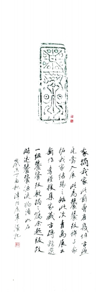 《我拓我家》最早入展的饕餮器物是一片古燕半瓦,我們特意請著名建筑學(xué)家、好友覃力教授題跋。他完全是以一個建筑專業(yè)人士的視角,來題寫這段跋語的:“先秦瓦當(dāng)已有飾動物、云紋、夔文圖案者,此類瓦當(dāng)與后世差異較大。其中戰(zhàn)國之燕瓦,有饕餮之紋樣,風(fēng)格質(zhì)樸,獨具一格,向為藏家所重。”幾句話就把半部建筑史都涵蓋其中了。這件燕瓦實為饕餮紋飾與《我拓我家》結(jié)緣之始。而兩年之后的青島新作展,因我家又陸續(xù)購藏了一些饕餮磚,使得李瑾可以搜羅更多的饕餮紋飾精拓送展?!段彝匚壹摇放c饕餮紋飾的緣分也更深更廣了。