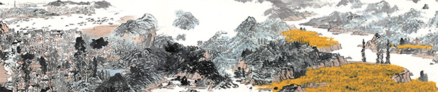 長江是母親河,長江經(jīng)濟帶的提出預示著這里將是我國發(fā)展戰(zhàn)略的重要依托。因此,創(chuàng)作長江題材作品的使命,使何家安產(chǎn)生了強烈的創(chuàng)作沖動。他于2013年開始動筆,多次沿江徒步寫生收集素材,耗時5年完成了長105米、高1.25米的巨幅長卷。畫作西起金沙江源頭,東至上海吳淞口,用精湛的筆墨重點刻畫了重慶、武漢、南京、上海等城市,同時還描繪了三峽大壩、長江大橋等現(xiàn)代建筑,使這一繪畫題材有了鮮明的時代特征?!堕L江新卷》既有千山萬壑、山重水復、咫尺天涯之意趣,又有筆精墨妙、酣暢淋漓之痛快,充分體現(xiàn)出畫家豐富的生活積累和深厚的傳統(tǒng)功力。本次展覽共分為兩部分,除展出《長江新卷》外,還展出了藝術家近期的部分作品。