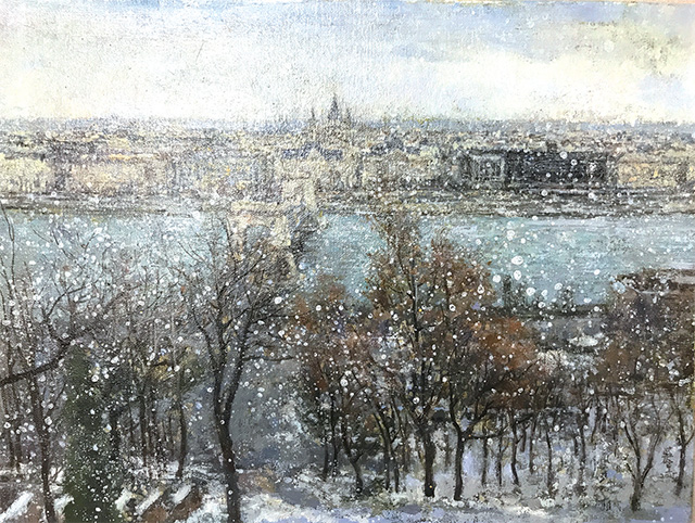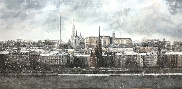2014年春,我在北京畫院美術(shù)館初次見到了莊重的油畫作品。在他所擅長的倒影和俯瞰航拍主題作品中,最打動我的當(dāng)屬那些淡雅朦朧的倒影系列?!坝悬c兒巴比松、有點兒印象派、有點兒柯羅、有點兒莫奈”,是我對其畫作的第一印象。同是2014年,我因協(xié)助畫院籌備次年舉辦的齊白石首次境外大展而數(shù)次去往匈牙利首都布達(dá)佩斯,隨著對這座多瑙河畔的城市了解越多,好感也就油然而生。我喜歡住在布達(dá)山頂?shù)臐O人堡旁邊的酒店,并非因為這里守著旅游景點,而是因為這里離國家美術(shù)館只有咫尺之距,便于我觀展開會。記得初冬那次,恰好莊重發(fā)來微信問候,我隨手發(fā)給他一張我剛拍的照片,那是酒店窗外冬日晴空下的漁人堡和多瑙河。沒想到他很快回復(fù),他年初才剛來過布達(dá)佩斯看過卡拉瓦喬大展,印象極好,也有頗多創(chuàng)作欲望,一拍即合的我們暢聊了許久。第二天由于時差緣故,睜眼已是國內(nèi)時間午后,手機(jī)卻已有幾條微信留言。打開一看,莊重竟一夜之間根據(jù)我發(fā)給他的照片將兩幅油畫小稿創(chuàng)作完成。我看罷激動不已,兩幅小稿不僅契合我身臨其境之感,更是他最擅長的畫風(fēng),我隨即回復(fù)他,“你以東歐主題創(chuàng)作一個系列辦個展覽如何?我來給你策展?!庇谑牵从谝粡堈掌呐既挥|動,不謀而合的我們在近三年的不斷探討和打磨中最終呈現(xiàn)出本次“意象東歐”主題展覽。那張意外喚起他創(chuàng)作欲望和靈感的照片,則成為了展覽中的《布達(dá)佩斯之一》和《布達(dá)佩斯之三》,也是本次“意象東歐”展覽中藝術(shù)家最先完成的作品。