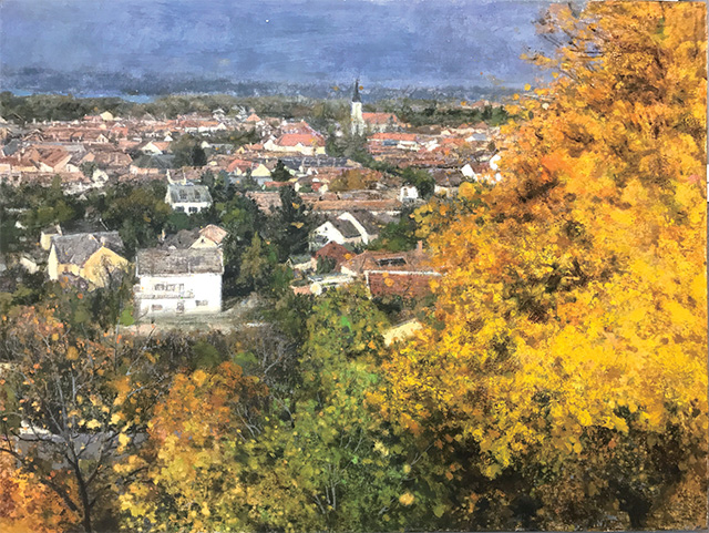 其次,拋開科學(xué)性的焦點透視觀察方法和從具象到抽象,從描繪形似到追求意境的創(chuàng)作手法演變,色彩始終是西方風(fēng)景畫中最重要的元素。而莊重對色彩細(xì)致入微的敏銳和絕佳的把控感是令我印象深刻的。要知道,中國并非是油畫天然的土壤。我國名山大川中的層巒疊嶂與云霧繚繞,最適合用濃淡暈染的水墨來表達(dá)。反觀歐洲,經(jīng)緯度差異所造就的光影變化、快速移動的低壓云層、鮮艷飽和的色澤濃度、加之歐洲人與生俱來的色彩感覺,構(gòu)成了西方油畫中豐富的色彩關(guān)系。想更好地呈現(xiàn)歐洲風(fēng)景,身臨其境的熏陶是必備條件。因為只有站在那片土地上,我們才可能明白英國為何能誕生透納;德國因何能出現(xiàn)大衛(wèi)·弗雷德里希;法國緣何能成就印象派。小約翰·施特勞斯之所以能譜寫出眾人最耳熟能詳?shù)摹端{(lán)色多瑙河》,不僅是詩意的贊頌,更是眼見的真實。數(shù)次的東歐采風(fēng)之行,在給予藝術(shù)家創(chuàng)作素材的同時,最重要的是去感受歐洲風(fēng)情中的氣息。而身為土生土長的南京人,能夠在有限的旅行采風(fēng)中去體悟歐洲特有的色彩關(guān)系并學(xué)以致用,則絕非寫生描摹畫照片那么簡單。幾次金秋時節(jié)的旅歐經(jīng)歷,讓他通過展覽中整體偏黃的色調(diào)去應(yīng)景地呈現(xiàn)多瑙河畔沿途金秋的美景。歐洲夕陽下映射在湖面那淡淡的紫、捷克境內(nèi)普遍的紅磚色系屋頂與秋色那“奇妙的和諧”、晴朗天空下的藍(lán)色多瑙河、布達(dá)佩斯初冬彌漫在多瑙河上的灰調(diào)濃霧以及雪后建筑與自然間冷暖關(guān)系,莊重將這些轉(zhuǎn)瞬即逝的瞬間用畫筆詳盡地記錄下來,并渲染出專屬于自己的色調(diào)與記憶中的感覺。