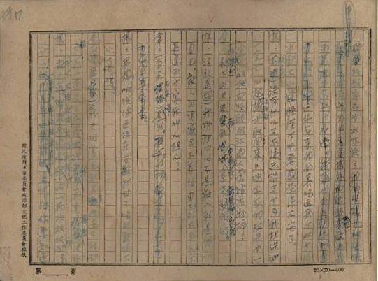 整篇手稿用藍(lán)色鋼筆寫在20×20的方格稿紙上,稿紙紙張粗糲,與我們對(duì)戰(zhàn)時(shí)重慶的物資供給情況的想象一致。整本手稿共計(jì)215頁,有修改痕跡。修改明顯可以分成前期和后期兩個(gè)階段,以藍(lán)色與黑色字跡相區(qū)分。陽翰笙的筆跡稍顯潦草,顯出為創(chuàng)作激情驅(qū)使而奮筆疾書的戰(zhàn)斗狀態(tài)。