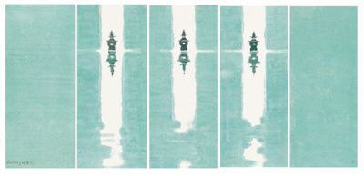 在陳家泠筆下,“三潭印月”水天一色,湖面清波蕩漾,以淡墨暈染于絹上,更顯幽深靜雅;“柳浪聞鶯”是線的世界,拂面的柳絲柔美地飛舞著,盡展春日西湖的勃勃生機(jī);“花港觀魚”以色彩取勝,“花著魚身魚嘬花”,一派魚樂人歡的場景……十件作品風(fēng)格各異、形式各異,各盡其妙,各現(xiàn)其境,最終以五條屏的形式,統(tǒng)一為一個(gè)整體。那是他對(duì)家鄉(xiāng)、對(duì)母校感恩又眷戀的情感表達(dá)。