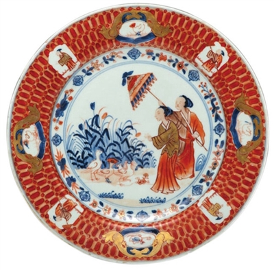 清代仕女畫面的瓷器在外銷瓷中十分常見,如仕女撐傘、仕女梳妝、仕女觀斗雞、仕女采桑、仕女放風(fēng)箏等,足見當(dāng)時歐洲人對仕女題材瓷器的喜愛。本文所要介紹的這件清乾隆青花礬紅描金瓷盤,飾以撐陽傘仕女圖,源自考納利·普朗克畫作,盤外壁繪有青花昆蟲。此盤直徑23.5厘米,高2.5厘米,足徑13.5厘米。盤面紋飾以青花礬紅描金等技法并用繪制圖案,制作精美,華貴典雅,光彩照人。盤面圖案布局合理,共分三層:盤中心為撐傘仕女圖,陽光下,池塘畔,水草茂盛,鮮花綻放,禽鳥歡躍,一衣著華麗的女主人佇立欣賞美景,身后一侍女為其撐傘遮陽;第二層以一周折枝花草裝飾;盤沿部分則以礬紅描繪錦地,留出8處開光,開光內(nèi)繪有仕女、飛禽等兩兩對稱的邊飾。盤背面還有不常見的青花昆蟲紋飾。這類圖案的瓷盤是外銷瓷中的佳作,頗受海外歡迎,外國許多博物館中也有展示,并被列為“特別訂制”瓷盤。不少外銷瓷書刊均有記載,拍賣會上價格不低,很為藏家追捧。