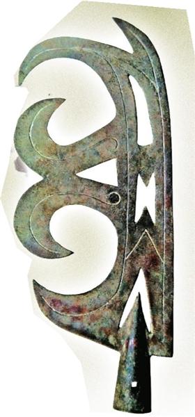 這件鉤戟長(zhǎng)37.7厘米,寬15.2厘米。尖端分叉,上鋒較長(zhǎng),下鋒較短,器身有三處鏤孔,形狀均不太規(guī)則。背部有左右相反的彎鉤形裝飾,下有短銎,銎上有長(zhǎng)方形穿孔。這種形狀的鉤戟非常罕見(jiàn),寶雞竹園溝西周墓地曾出土一件亦有類似的鉤形裝飾(圖二),但區(qū)別還是很大的。結(jié)合這兩處墓地的年代,這件鉤戟應(yīng)為西周早期的兵器。此器造型奇特,裝飾風(fēng)格繁瑣夸張,鮮有與之相同者。陳昭容研究員認(rèn)為應(yīng)該不是實(shí)用器,推測(cè)或?yàn)閮x仗之用。這是戴家灣墓地出土的最有特點(diǎn)的兵器,為研究其文化來(lái)源提供了重要線索??紤]到它與竹園溝出土的青銅戟有相似之處,不排除兩者曾受到相同文化之影響。