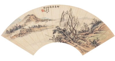 相比別的畫作,陸小曼的扇畫尤為精致,深受當(dāng)時(shí)名士們的喜愛。在一幅陸小曼于1943年所畫的《柳蔭垂釣圖》中,一只帶篷的小船靜靜地泊在湖上,隱者面對(duì)青山悠然垂釣,岸邊柳絲垂拂、柔情似水。畫面似一幅素雅的綢緞,營(yíng)造出一種靜謐清幽的情趣,意境清遠(yuǎn)蕭疏。用筆輕而松,墨色簡(jiǎn)淡卻無纖細(xì)浮薄之感,以淡墨簡(jiǎn)筆有神地籠罩住整個(gè)畫面,可謂天真幽淡。畫中那種書卷之氣,深深地感染著我們,這也正是她的作品個(gè)人魅力之所在。