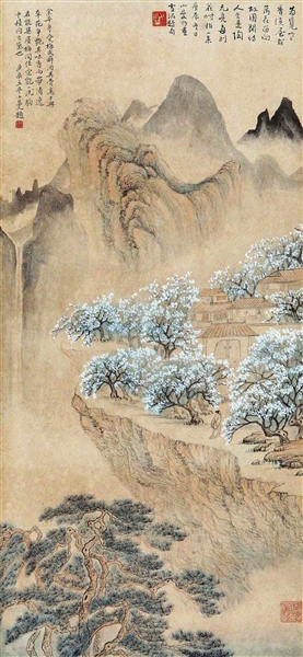 陸小曼致力于研究元代倪云林、明代沈周、清代王鑒等大師的作品,她的畫作也形成了文人畫的風(fēng)格,賦色清麗雅致,格調(diào)脫俗,潤(rùn)澤秀麗。在她的《梅屋圖》上,隱士在深山幽谷中欣賞耀目的白梅,詩意盈滿,幽趣盎然。整幅畫面古樸幽雅、清新悅目。小曼在畫上自題有“余生平愛梅成癖,因其骨高不與群花爭(zhēng)艷,其味香而清逸。若能筑屋梅間住,定能一洗胸中積悶之氣也?!绷碛挟嫾覍O雪泥題句為:“為覓空香繞屋栽,萬花留向故園開。詩人合是陶元亮,每到花時(shí)始一來。”妙句添彩,可謂恰合畫意。