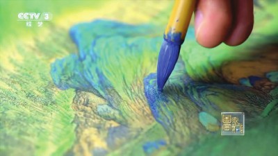 ▲中央美院的老師馮海濤在多年研究后用兩個月復制了十分之一的《千里江山圖》卷。他在節(jié)目中還原王希孟作畫步驟,告訴觀眾——中華民族一代代都有藏樸守拙的匠人。他們守護瑰寶。因為他們,中華文明經(jīng)五千年賡續(xù)不斷,有了鮮活寫照。圖為馮海濤復制十分之一《千里江山圖》卷的畫面。(節(jié)目截圖)