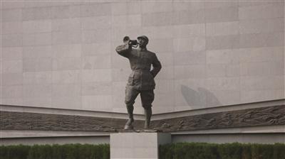 而位于紀(jì)念館主體的門口那堵120米長的《勝利之墻》則是第四篇章,8米高的墻上一個大大的“V”字貫穿始終,底部昂首吹軍號的中國軍人腳踏日軍的鋼刀和頭盔,“V”字一邊是黃河在咆哮,中國軍民“大刀向鬼子們的頭上砍去”,另一邊是滾滾長江奔騰不息,勝利的部隊凱旋南京。
