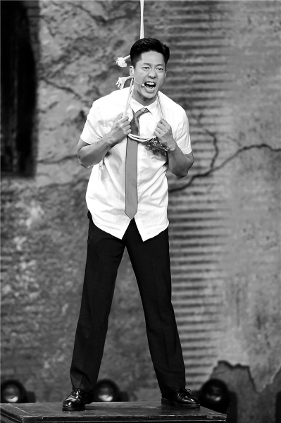 另一段則是凌瀟肅沖上桌子準備上吊時,吼起了那段關中民謠:“他大舅他二舅都是他舅,高桌子低板凳都是木頭,金疙瘩銀疙瘩還嫌不夠,天在上地在下你娃甭牛?!绷铻t肅透露,這是原劇本中沒有的,也是他自己加入的“神來之筆”。他說,在排練前他專門看了一遍《最愛》電影,片中郭富城演這場上吊戲的時候很寫實,但在轉(zhuǎn)換成戲劇演出時,從床邊快步走上桌子,再拉著繩子上吊,整個過程沒有對話,他覺得太干了,太浪費這個距離了,只憑借肢體動作也根本表現(xiàn)不出人物這時候的心情。于是他想到了在演《關中匪事》時經(jīng)常哼唱的這首歌謠,頓時覺得非常合適。