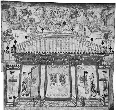 此次展覽中單體面積最大的一件展品是《忻州九原崗北朝壁畫墓墓道北壁壁畫》,它長3.2米,高3.5米。壁畫中繪有一座規(guī)模宏大的木結(jié)構(gòu)建筑,建筑中華麗的門樓、廡殿頂、復(fù)雜的斗拱、重復(fù)的額枋、特殊的瓦釘、彩色的鋪地磚,建筑中的一磚一瓦都生動、逼真,特別是雙柱式的斗拱在以往的資料中未曾見過。這是首次在同時(shí)期墓葬壁畫中發(fā)現(xiàn)木結(jié)構(gòu)建筑,讓我們有幸第一次在壁畫中領(lǐng)略北朝建筑的風(fēng)采。