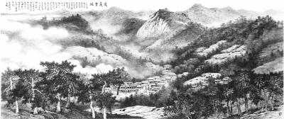 我沿著茶園的小路翻過(guò)一座小山,一組松樹(shù)霍然映入眼簾,沒(méi)想到,這個(gè)我擅長(zhǎng)畫(huà)的樹(shù)種“跑”來(lái)救急了。是啊,看那排排挺拔的青松,威嚴(yán)肅立,像戰(zhàn)士一樣守衛(wèi)著革命圣地,它是勝利的象征,也解決了我線性安排的難題。青松枝繁葉茂,水田隨山勢(shì)排列,山巒間的茶園長(zhǎng)短相接、方圓相依,連綿起伏,一下子解決了畫(huà)面結(jié)構(gòu)的問(wèn)題,原本還是模糊的畫(huà)面逐漸清晰起來(lái)。白云映襯青松,青松環(huán)抱會(huì)址,民居散落山岡,茶園隨山勢(shì)緩緩展開(kāi)……一幅壯美的山水畫(huà)卷呈現(xiàn)在眼前。形象清晰,方向明確,畫(huà)起來(lái)就非常順手,我以后的創(chuàng)作也進(jìn)展順利,一氣呵成。