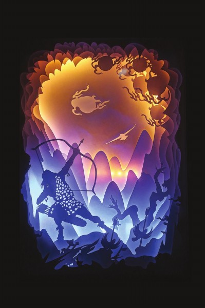 李雯琪紙雕燈箱《后羿射日》。紙與多媒體光影復合成神秘而又夢幻的創(chuàng)世神話故事。(展方供圖)