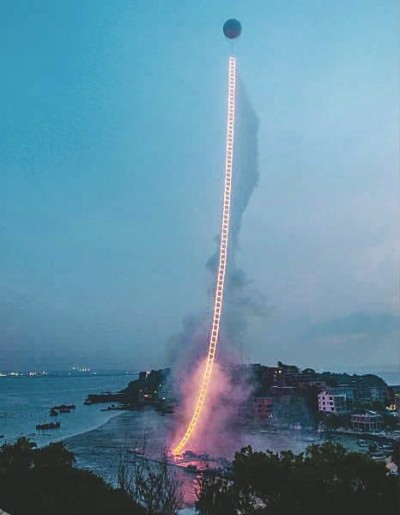 ▲中國四大發(fā)明之一的火藥,用到藝術中,可以有怎樣的呈現?蔡國強一直在用爆破、焰火探索著當代藝術的邊界。2015年,在家鄉(xiāng)泉州的一個小島上,用最熟悉的方式,蔡國強點燃了一根小火柴。緊接著,一座500米高的金色焰火的“天梯”拔地而起,與無垠宇宙對話。去年9月上映的紀錄片《天梯:蔡國強的藝術》記錄了背后的一切。(蔡國強工作室供圖)