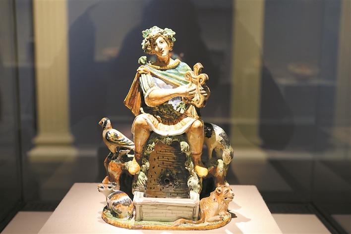 還有一些作品直接被塑為人形,比如16世紀末,由烏爾比諾的潘塔納茲工坊所作的人像水罐,表現(xiàn)的是傳說中半人半神的奧菲歐彈奏豎琴迷惑動物,他坐在一個圓桶上,液體從桶下方的小孔流入池中。據(jù)克勞迪婭·卡薩利介紹,這件產(chǎn)品專為私人居所而設(shè)計,可能在豪奢的宴會上用作烈酒容器。