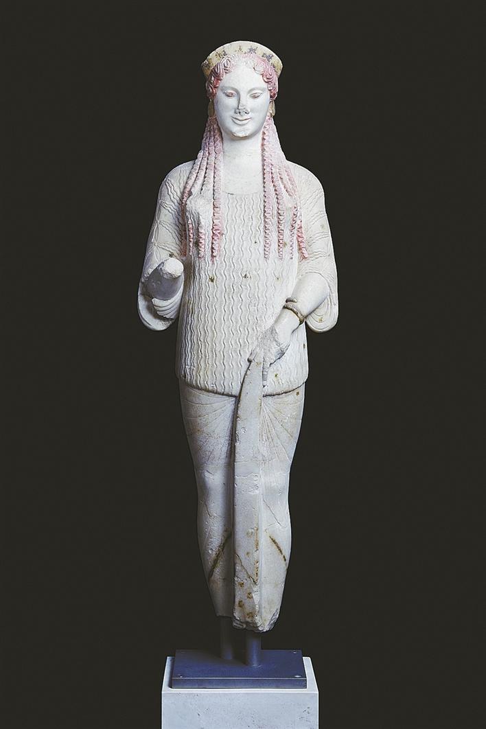 科拉雕像(公元前520—前510年),高1.15米,由大理石制成。公元前7世紀中葉,隨著古希臘文明與地中海東岸和埃及文明的聯(lián)系與交流,在希臘出現(xiàn)了用硬質(zhì)材料雕刻的等身雕像和比真人更大的雕像。庫羅斯和科拉,意為少年和少女的大理石雕像,是希臘古風(fēng)時期第一批獨具特色的雕像。在衛(wèi)城的考古發(fā)掘過程中,發(fā)現(xiàn)了超過200尊科拉雕像,從而使衛(wèi)城博物館這個門類的收藏量冠絕全球。
