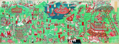 1941年春末,張大千來到甘肅敦煌莫高窟。他率門人子侄,用兩年時間對莫高窟壁畫進(jìn)行了歷史上第一次大規(guī)模臨摹工作。兩年不辭辛勞的臨摹使得他對畫中“吳帶當(dāng)風(fēng),曹衣出水”的風(fēng)韻有了深刻領(lǐng)悟,并將其吸收到自己的創(chuàng)作中。