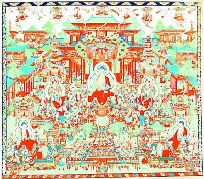 “我父親總結(jié)過敦煌壁畫臨摹的三種方法——客觀臨摹、整理臨摹和復(fù)原臨摹。張大千先生用的就是復(fù)原臨摹。他有一種觀念,就是現(xiàn)在看到的壁畫上是黑的區(qū)域,實(shí)際上是氧化了,原來肯定是紅的,所以,他的臨摹作品大部分都是紅的或綠的,這樣的色調(diào)成了張大千先生特色的復(fù)原臨摹。我也用張大千先生的方法去臨摹過一些壁畫,最后得到的畫很鮮艷。后來,我們認(rèn)為應(yīng)該要對壁畫色調(diào)進(jìn)行分析,哪些是氧化了的。原來是大紅的,我們要把它畫成紅的;有的是水紅,又變了顏色。張大千先生的臨摹成果和特色,后來成為臨摹壁畫很重要的參考?!背I衬扰空f,“現(xiàn)在,張大千先生的臨摹品已經(jīng)成了他的一個特色。離開敦煌以后,他又創(chuàng)作了許多新的作品,也按照敦煌的風(fēng)格來改進(jìn)他的人物繪畫作品——勾線開臉,表現(xiàn)得特別精細(xì)?!?/p>