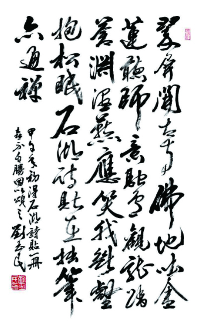 文人書法特別推重內(nèi)容的原創(chuàng)性,把文學(xué)與書法的珠聯(lián)璧合、相得益彰,視為既定的目標(biāo)和要求。從王羲之的《蘭亭集序》到杜牧的《蘇小小詩帖》、蘇軾的《黃州寒食帖》、鄭板橋的《題竹石詩》等無不如此。劉玉民以長篇小說知名,但他同時(shí)創(chuàng)作和發(fā)表了不少古體詩詞,其中《題畫詩》《自度曲六首》《石湖詩貼頌》《重游百脈泉》等,都成了他書法創(chuàng)作的題材和成果。