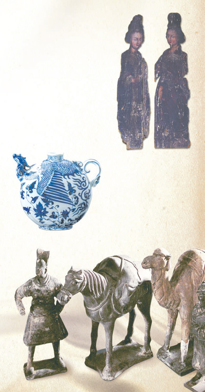 上圖:新會木美人,明代。兩個穿著中式服飾的西洋美人。 廣東新會博物館供圖 中圖:景德鎮(zhèn)窯青花鳳首扁壺,元代。所繪圖案為一只鳳凰昂首奮飛,在意大利服飾和繪畫中也有大量中式鳳凰圖案。 首都博物館供圖 下圖:陶俑,元代。絲綢之路上的一支商旅隊(duì)伍。 內(nèi)蒙古博物院供圖