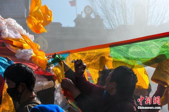 西藏大昭寺經(jīng)幡柱“換裝”迎藏歷新年