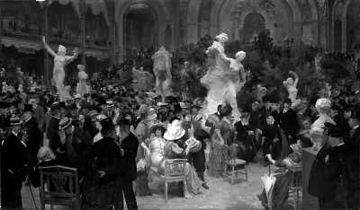 畫家朱爾·亞歷山大·格倫的《法蘭西藝術(shù)家沙龍的一個(gè)周五》(1911)就展現(xiàn)了沙龍的盛況。作品呈現(xiàn)出一派熙熙攘攘的景象:大廳里、樓梯上、樓廊間,擠滿形形色色的人群。畫中矗立的幾尊乳白色人物雕塑,巧妙緩解了黑壓壓的人物可能帶來的沉悶感;它們中和著整個(gè)作品的色彩,也增強(qiáng)了畫面的縱深感。畫面中央,一位年輕時(shí)尚的白衣女性轉(zhuǎn)身望向她的同伴,她們的對話在這人聲鼎沸的地方仿佛顯得格外突出,宛如樂隊(duì)中的一曲小提琴二重奏。這幅作品不僅有美學(xué)價(jià)值,也有史料價(jià)值。畫上的一百多位人物均有原型,其中有當(dāng)時(shí)的學(xué)院派畫家,甚至還出現(xiàn)了總統(tǒng)。