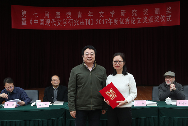 丁帆為《中國現(xiàn)代文學(xué)研究叢刊》2017年度優(yōu)秀論文獎(jiǎng)獲獎(jiǎng)?wù)哳C獎(jiǎng),李娜代趙稀方領(lǐng)獎(jiǎng)