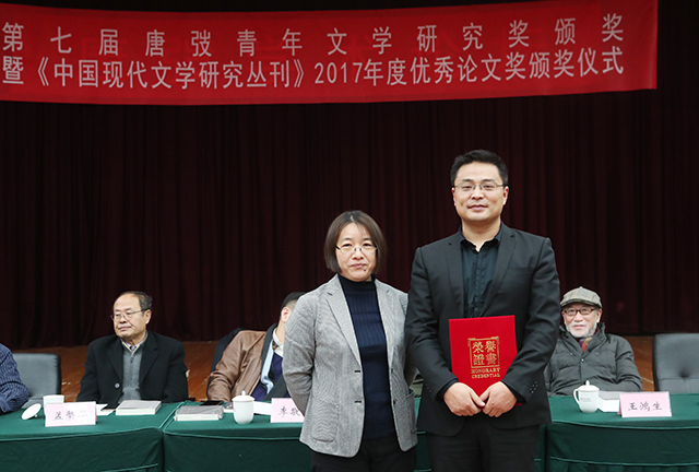 劉勇為《中國現(xiàn)代文學(xué)研究叢刊》2017年度優(yōu)秀論文獎(jiǎng)獲獎(jiǎng)?wù)呔次臇|頒獎(jiǎng)