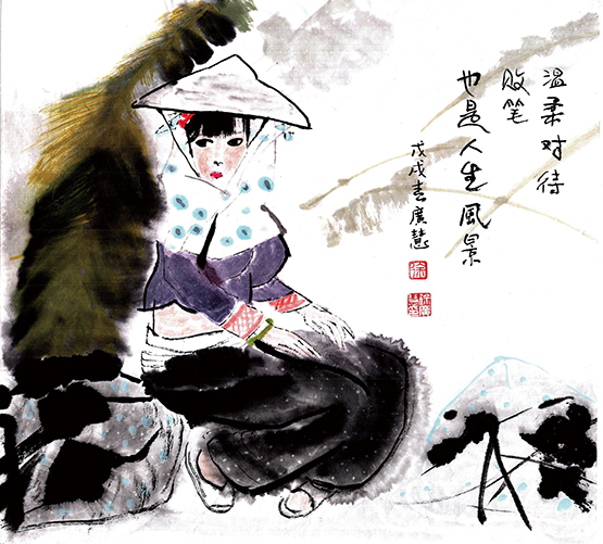 畫得不算太好,整體看還可以。輕吁一口氣,一種從未有過的淡定和自信油然而生。暗暗感謝自己在畫畫的過程中,沒有因為出現(xiàn)意外的筆觸就此擱筆。給畫起個什么名字呢,提著筆立在畫前,神思天馬行空,猶疑不定,突然,一個句子出現(xiàn)在腦海里,就表達(dá)這次作畫的感受,于是就有了——《溫柔對待,敗筆也是人生風(fēng)景》。