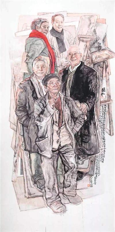 尉曉榕屬于中國美院在職教授中,為數(shù)不多的和“浙派五老”李震堅(jiān)、周昌谷、方增先、宋宗元、顧生岳都有過交往的后學(xué)一代。在作品中,尉曉榕從每位老先生個(gè)性特點(diǎn)入手,深入刻畫了他們最有代表性和感染力的瞬間。中國美院校友、“浙派五老”學(xué)生何加林看到作品說:“這是一幅有高度、有溫度的高峰之作。我看畫時(shí)回到了和老師們朝夕與共的日子,我的眼眶是濕的?!蔽緯蚤疟硎?,這些老師都對(duì)自己很好,創(chuàng)作這幅作品是出自內(nèi)心的感動(dòng)。