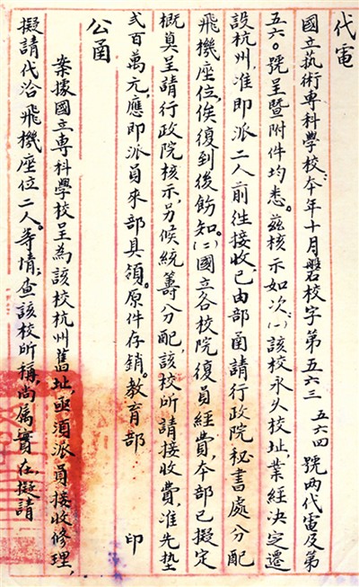 1945年教育部令國立藝專全體復(fù)員杭州文件,并設(shè)杭州為永久校址。