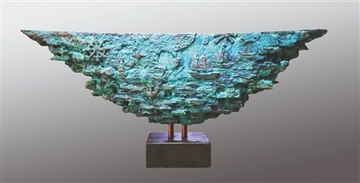 海南大學(xué)副教授、海南省雕塑藝術(shù)學(xué)會副秘書長張睿就是其中一位。此次,他帶來的展品是《絲路》?!白髌肥褂贸橄蠛途呦笙嘟Y(jié)合的形式,表現(xiàn)了‘一帶一路’的主題,體現(xiàn)絲綢之路和航海精神。外形看起來像張開的翅膀,又像船身舊船木,又像一個瓷碗等,倒三角形的外形增強(qiáng)雕塑的形式感。雕塑的兩面主要表現(xiàn)了地圖、帆船等,錨、舵等航海元素,以及漁民和海洋元素等。色彩用了深藍(lán)綠和古銅色,跟主題呼應(yīng)?!睆堫8嬖V記者。