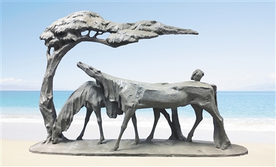 在博鰲金灣的沙灘上,一座樹脂雕塑作品《長空橫海色》,引來不少游客駐足。作品表現(xiàn)一對輪廓秀麗的駿馬悠然漫步在海邊,一匹馬仰頭看著天邊的落日,另一匹則緊緊依偎其身旁閑適地垂頭吃草,天邊的海平線在余暉的渲染下顯得更加平和寧靜,此時此刻,雕塑與環(huán)境融成了一個整體……