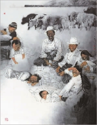 感悟羅江的藝術(shù)生命,可強烈體會到彝族人家國一體的新時代情懷。他在嫻熟運用黑、白、灰墨色外,還善用褚紅色、蔚藍色、淺綠色、淡黃色,將各種顏色協(xié)調(diào)有度、變幻無窮,做到新奇而不俗、夸張而不艷,既烘托了中國畫大寫意的風(fēng)格,又深化了對時代、對生命的敬畏。同時,他注重將新時代主題巧妙融會到藝術(shù)生命體系之中,牢牢掌控藝術(shù)走向與情趣,給作品賦予深刻熱烈的思想高度,讓每一幅作品都體現(xiàn)出對生活的摯愛、對生命的敬重、對祖國的責(zé)任。系列作品《烏蒙山》用豪邁凝練的大寫意手法,描繪不同生活狀態(tài)下彝族女人與牲畜的關(guān)系,表現(xiàn)出道法自然、天人合一的東方智慧。大型主題創(chuàng)作《誓盟》用細膩深刻的藝術(shù)風(fēng)格,講述云南26個民族代表一心一意聽黨話、跟黨走,為建設(shè)平等、自由、幸福的民族大家庭而奮斗的美好故事,體現(xiàn)出了火熱的民族情懷和愛國主義精神,具有厚重的精神內(nèi)涵和審美價值,也樹立起藝術(shù)服務(wù)人民、謳歌時代的鮮明導(dǎo)向。