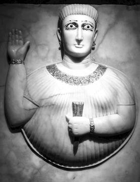 展廳入口處一件掛在墻上的女人半身浮雕石像,將記者帶入世界文明的語境中。這件浮雕是個石碑,來自阿拉伯南部,展現(xiàn)了一名佩戴鑲鍍金珠寶的婦女形象。女人仿佛是從長方形背板上的圓洞中鉆出來的。她抬起右手,掌心向外,左手握著貌似用金子做的一把小麥,專家說這是生育的象征。女人穿著短袖百褶上衣,佩戴精致的金項鏈。她的眼睛特別醒目,不僅用石頭鑲嵌作眼珠,還在其上嵌了黑色的石頭作為瞳孔,睫毛用金屬制成,眉毛也殘留著鑲嵌物。專家說,這可能是一件表現(xiàn)婦女祭司向太陽女神求情場景的陪葬石碑。這種形象的石碑是阿拉伯南部經(jīng)典的作品風(fēng)格,倫敦大英博物館有一件與此極為相似的公元一世紀(jì)作品。