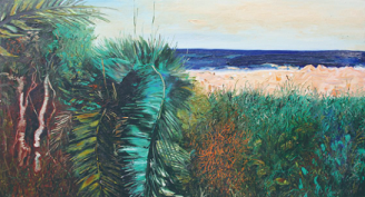 馬杰在2015年創(chuàng)作了“綠島”系列作品?!对铝翞场贰渡钏{(lán)色的?!贰段绾蟮暮!酚脤憣?shí)的方法再現(xiàn)了海南島東部沿海地區(qū)的自然景色。海南東部地區(qū)雨量充沛,陽光明媚,沿海地形復(fù)雜,植被茂盛,處處透露著靈光與精氣,他習(xí)慣依據(jù)自己的感受,有意選擇靚麗的自然景象與構(gòu)圖,以油畫特有的色彩、顏料和筆觸,直接、肯定地表現(xiàn)出自然景色的美、狂野與豐富。所以,他的筆下出現(xiàn)了更多以熱帶植被為前景,色彩強(qiáng)烈而豐富繁多的綠島系列的作品?!逗_叺哪韭辄S》《叢生(九)》《叢生(四)生長》等作品則強(qiáng)調(diào)繪畫語言對繪畫主題的表現(xiàn)。狂放的筆觸、恣野的線條,甚至有意識地控制不經(jīng)意的繪畫,不僅把喜歡的景物畫出來,還通過繪畫反映出自己對生活以及油畫藝術(shù)的理解。與此同時,馬杰還常選取一些獨(dú)具特色的海南風(fēng)景,以較特殊的角度進(jìn)行描繪,如一塊白云、一片草地、一棵矗立的椰子樹,運(yùn)用鮮亮飽和的色彩與快速跳躍的用筆,讓色彩在密集的筆觸交融中,與環(huán)境融為一體,畫面既呈現(xiàn)出清新宜人的格調(diào),又不失活潑律動的節(jié)奏?!栋自啤贰稉u曳的風(fēng)》《寂靜的風(fēng)景》等作品,都是這種類型的創(chuàng)作。
