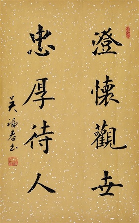 對(duì)待傳統(tǒng)楷書(shū),吳福春有著豐富的經(jīng)驗(yàn)和純正的承傳,他始終崇奉一個(gè)看似笨拙而原始的習(xí)書(shū)辦法——苦練。出笨力氣,下苦功夫。一個(gè)“觀海聽(tīng)濤”,他可以不厭其煩寫(xiě)上千遍。有時(shí)寫(xiě)字入神,動(dòng)不動(dòng)就練到深夜。這樣嚴(yán)謹(jǐn)?shù)臑闀?shū)態(tài)度,成就了吳福春中正妍美、浩氣堅(jiān)質(zhì)、雄健有力的藝術(shù)風(fēng)骨。有人形容他的作品“于老辣中見(jiàn)骨力,于自如中見(jiàn)俊秀,于童心質(zhì)樸中見(jiàn)飄逸,其風(fēng)格奇而不詭,美而不媚,整體諧和,妙趣橫生,整體感覺(jué)率真、隨意、干凈、利索、妥貼、自然”。