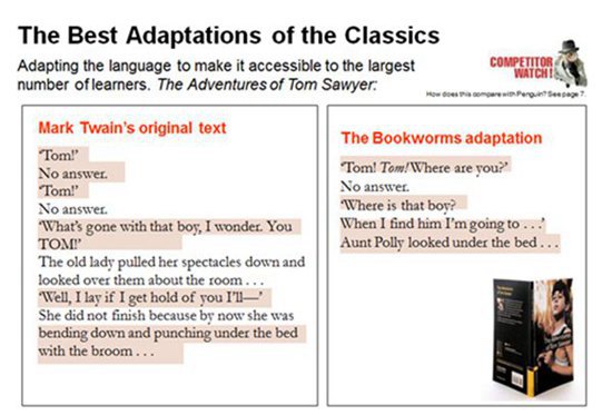 芭斯特強調(diào),重寫經(jīng)典小說并不僅是簡化語言和縮短長度?!俺晒Φ母膶?,首先要遵守的原則,就是符合原著中作者的原意。所以,必須詳細(xì)分析原著,包括其敘事結(jié)構(gòu)、人物描寫、修辭格……之后,改寫者要建立一套全新的敘事結(jié)構(gòu),遵守‘書蟲’系列各個分級類別的用詞原則,根據(jù)原著的核心精神,創(chuàng)建全新的文本?!?/p>