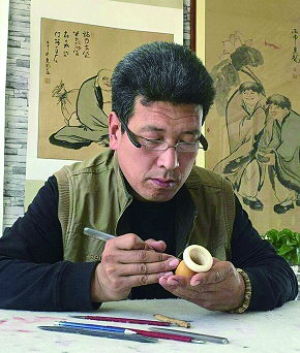 徐連龍說(shuō),真正開(kāi)始下決心學(xué)習(xí)砑花葫蘆,卻是因?yàn)樽约旱昧孙L(fēng)濕病,“不能干重活,我就想,怎么也得學(xué)點(diǎn)手藝養(yǎng)活自己啊?!本瓦@么著,徐連龍一邊學(xué)習(xí)繪畫,一邊跟著爺爺學(xué)習(xí)砑花葫蘆技藝。