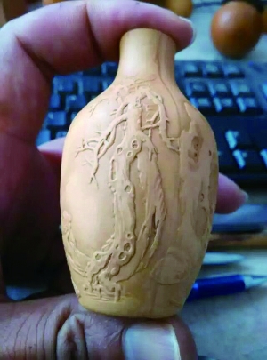 很快,徐連龍感覺(jué)到了不足,“過(guò)去的葫蘆砑花特別貧乏,就會(huì)做一些柏樹(shù)、草花等圖案?!比绾呜S富創(chuàng)作素材,讓徐連龍犯了難,“后來(lái)我在一本畫冊(cè)上看到劉守本先生的內(nèi)畫鼻煙壺,覺(jué)得這些圖案特別適合移植到葫蘆上?!本瓦@樣,1991年,徐連龍找到內(nèi)畫鼻煙壺大師劉守本,拜他為師學(xué)習(xí)內(nèi)畫??恐鴰煾档闹笇?dǎo)和自己多年的揣摩,徐連龍總算在葫蘆上砑出了層次豐富、圖案精細(xì)的人物畫,“將里邊的石頭、樹(shù)做出了浮雕效果,大家都覺(jué)得特別新鮮,也帶動(dòng)了市場(chǎng)上的人物畫題材?!?/p>