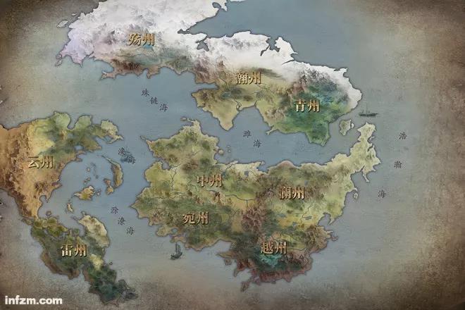 這是小說(shuō)《九州縹緲?shù)洝分疃嗟娜齻€(gè)州。在新版地圖里,九個(gè)州融匯了現(xiàn)實(shí)世界的典型地貌和氣候?!皩幹菔巧?,瀾州是苦寒雪國(guó),越州是南蠻沼澤,殤州雪山,雷州雨林,云州是少有人跡的地方?!弊x者西陵曲駕輕就熟地總結(jié)道。