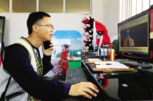 蘇濤設(shè)計(jì)民族服飾圖案時(shí)用手機(jī)與同行交流。