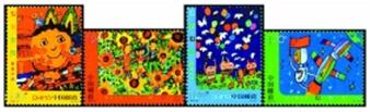 2009年6月1日,我國(guó)發(fā)行《祝福祖國(guó)》特種郵票,全套4枚,圖案分別為“我愛中華”“快樂生活”“熱愛和平”和“從小愛科學(xué)”。這套郵票通過少年兒童對(duì)自己美好生活的描繪,表現(xiàn)祖國(guó)六十年來的發(fā)展變化。經(jīng)專家評(píng)審,來至江蘇睢寧的4幅作品選為郵票圖案印制成郵票。4幅兒童畫的作者分別是宋志偉、劉茹、宋志威和孫鵬炎,年齡最小的只有6歲。