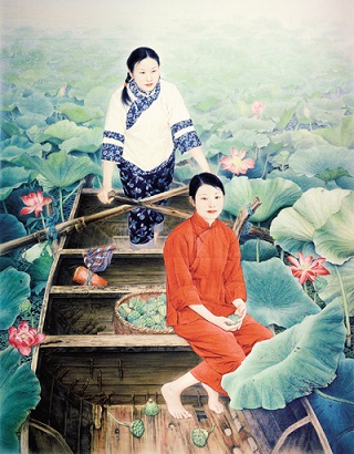從李乃蔚的作品中可以看出,他的稟賦中具備兩種相輔相成的品格:作畫態(tài)度極端認(rèn)真,求其技術(shù)精湛、語言技巧完備和形象真實(shí)生動(dòng)。技巧的精微、細(xì)致與否并不關(guān)乎繪畫品格的高低,關(guān)鍵是作品要有整體感,要有形象的生動(dòng)性,這便是中國(guó)畫論反復(fù)強(qiáng)調(diào)的不要“謹(jǐn)毛失色” 。繪畫創(chuàng)作不避諱精微、細(xì)致的描寫手法,李乃蔚對(duì)此有清醒的認(rèn)識(shí),他不是以顯示自己的寫實(shí)技巧為目的,而自覺“力求在傳承的基礎(chǔ)上融入當(dāng)代的審美情趣,表達(dá)自己的所思、所感、所悟,再現(xiàn)時(shí)代人物的風(fēng)貌與情懷、意韻與神采” 。李乃蔚筆下的現(xiàn)實(shí)人物與歷史人物,重視人物形象刻畫,在精確的形似中既表現(xiàn)對(duì)象外形的美和內(nèi)在的氣質(zhì),同時(shí)訴諸自己的主觀感情。寫實(shí)藝術(shù)最忌對(duì)物象純客觀地展示和作者感情的冷漠,而李乃蔚作品中的人物不論是早期的歷史題材《甲申三百年祭》 《黃帝戰(zhàn)蚩尤》 ,以及之后創(chuàng)作的諸多青年女子人像,如《染秋》 《秋語》 《流年》 《生日》 《湘妹子》 《山菊》等,以及描寫陜北民間樂手的《黃土情》 ,都可以感覺到作者對(duì)被描寫人物的深刻理解和他的感情傾向。在現(xiàn)實(shí)人物肖像中,他尊重對(duì)象,從人性的角度揭示他們自身的美感,與他們有內(nèi)在感情交流。因此,這些人物形象是鮮活的,藝術(shù)語言也富于靈韻,與缺乏感情的極端寫實(shí)的照相寫實(shí)主義作品迥然不同。