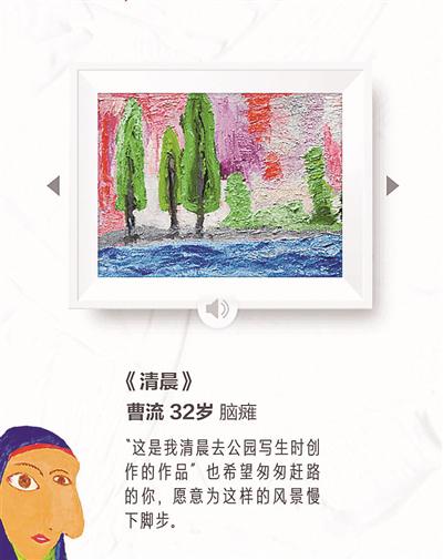 記者注意到,在“一元購畫”公益活動里,有兩幅32歲腦癱患者曹流的作品,一篇是《無?!?,畫的是一朵粉紅色的畫,另一幅《清晨》是他清晨在公園的寫生。