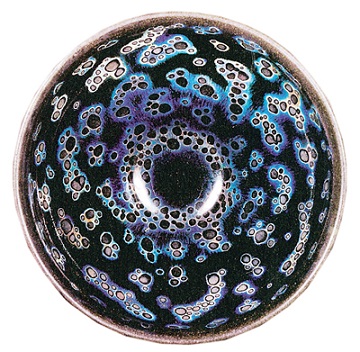 曜變天目盞在陶瓷界一直是傳說般的存在,它靜靜地陳列在東京靜嘉堂文庫,給予觀者的視角高度極佳,能夠剛剛好看到內(nèi)壁中的藍(lán)色窯變圓點(diǎn)。內(nèi)壁有2 / 3的面積曜變斑點(diǎn)比較集中,白色、紫色、藍(lán)色湊成了點(diǎn)點(diǎn)圓斑,釉水賦予的鮮明金光時(shí)隱時(shí)現(xiàn)。壓低手持望遠(yuǎn)鏡的視角,鏡頭變焦和對(duì)焦過程中,那藍(lán)色斑點(diǎn)和“五彩”炫光交織在一起。圍著天目盞轉(zhuǎn)著圈欣賞,隨著視線的移動(dòng),藍(lán)色圓斑的顏色會(huì)變幻不定,瑰麗奇詭得不像是人間之物,甚至透出一種“近乎妖”的感覺。那些藍(lán)色的曜變色彩很是沉穩(wěn),并不輕佻,像極了深夜晴空的星斗,這種體驗(yàn)非常玄虛。這抹藍(lán)色閃著釉光,與黑瓷簡(jiǎn)直是絕佳搭配,既顯出黑色的高級(jí)又突出藍(lán)色的高貴,可謂顏色審美中的罕見之作,難怪被人稱為“碗中宇宙” 。曜變,之所以難以復(fù)制和再現(xiàn),是因?yàn)閳F(tuán)團(tuán)簇簇的藍(lán)色圓斑實(shí)在是一場(chǎng)“星辰宇宙”般的意外,這種不可控才是它令人難忘的原因。