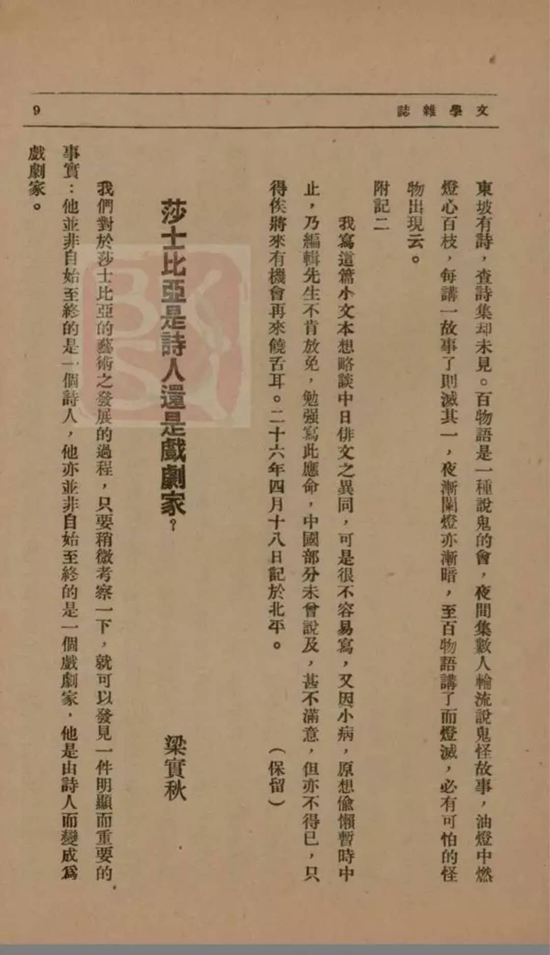 此文前曾交予文學(xué)雜志,而雜志???,遂又退回。今紀生來索稿,以此付之,已在一年后矣。二十七年十月二十三日。