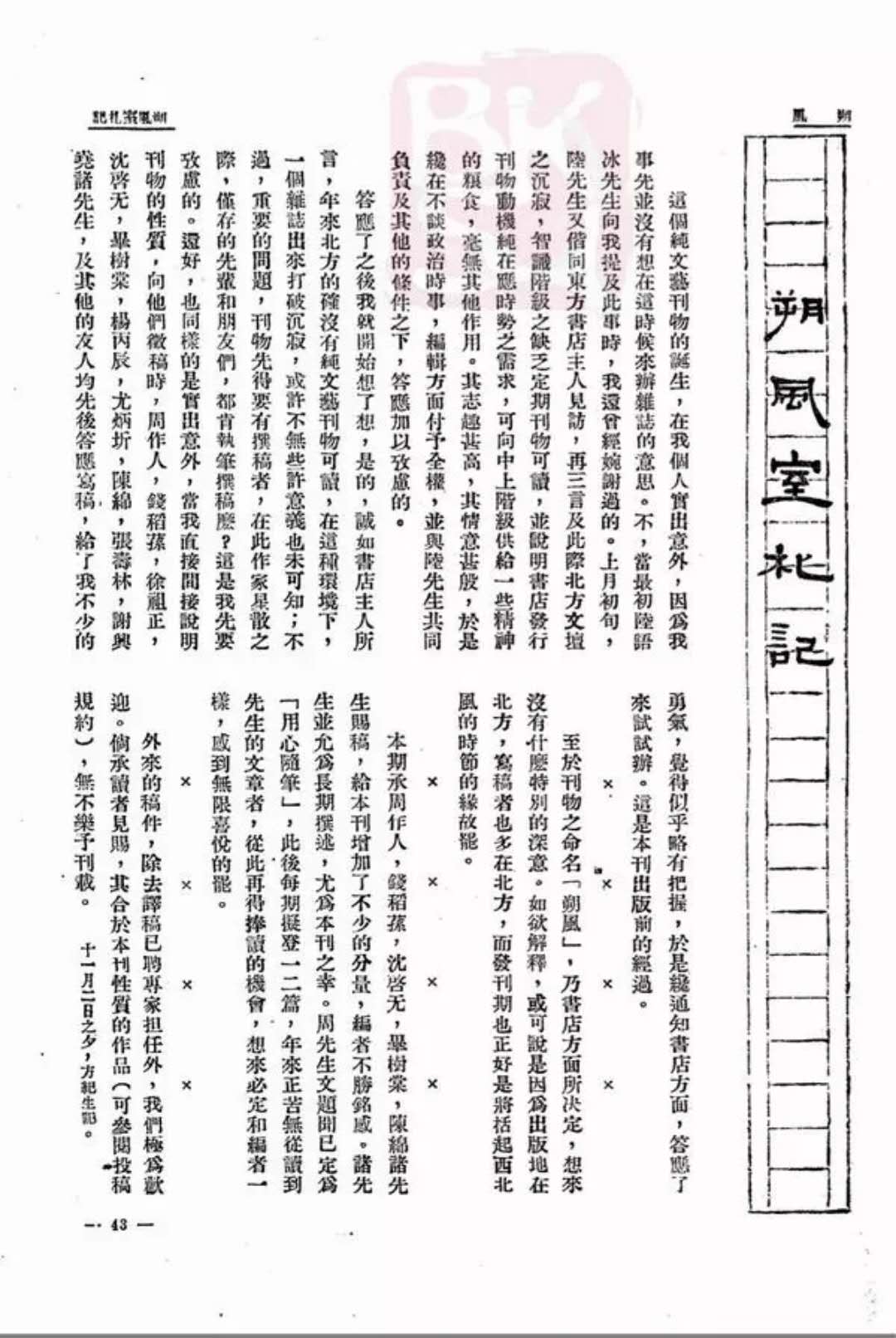 編者方紀生在1938年11月2日寫的《朔風(fēng)室札記》中提到,當他向周作人等約稿時,“均前后答應(yīng)寫稿”,“本期承周作人,錢稻蓀,沈啟無,畢樹棠,陳綿諸先生賜稿,給本刊增加了不少的分量,編者不勝銘感”,“周先生文題聞已定為用心隨筆,此后每期擬登一二篇,年來正苦無從讀到先生的文章者,從此再得捧讀的機會,想來必定和編者一樣,感到無限喜悅的罷”。