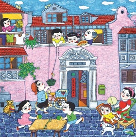 這種依據(jù)個(gè)人記憶來(lái)選題的創(chuàng)作形式被延續(xù)了下來(lái),目前西郊農(nóng)民畫(huà)的創(chuàng)作團(tuán)隊(duì)包含不同代際和各種來(lái)源,這就保證了它可以在畫(huà)面上跟隨西郊城鎮(zhèn)化的進(jìn)程,同時(shí)與時(shí)共進(jìn)地展現(xiàn)方方面面的上海風(fēng)情。伴隨著搬遷、購(gòu)房等帶來(lái)的人口流動(dòng),新涇也和上海的其他城區(qū)一樣,有了越來(lái)越多的遷入人口。梁瑞芬女士今年72歲,她的 《夏日的回憶》,畫(huà)的是上個(gè)世紀(jì)七八十年代她在石庫(kù)門(mén)里所見(jiàn)的快樂(lè)童年。那個(gè)時(shí)候流行打乒乓,聽(tīng)到樓下叫賣(mài)光明牌赤豆棒冰,急忙放下籃子夾著鈔票提上棒冰,阿爺在喝茶,阿婆在喂鳥(niǎo)……這樣老城區(qū)的市井風(fēng)情實(shí)在是太經(jīng)典的上海映象。與街坊鄰里的描述對(duì)應(yīng),李介蕓的 《迎春》是私房人家的年節(jié)情形。這幅畫(huà)是相當(dāng)寫(xiě)實(shí)的,從枇杷樹(shù)、山茶花到地磚、落地窗,都和家中實(shí)景一模一樣。畫(huà)者自己和阿公阿婆、丈夫孩子悉數(shù)出場(chǎng),活脫脫一幅畫(huà)筆下的全家福。畫(huà) 《驚心動(dòng)魄》的夏智陽(yáng)只有12歲,對(duì)賽車(chē)癡迷得很,各種賽道、零件講起來(lái)如數(shù)家珍。如果不放在西郊農(nóng)民畫(huà)的歷史線索里去觀察,他的這幅作品與普通的兒童畫(huà)無(wú)異,但這恰恰說(shuō)明了西郊的城鎮(zhèn)化已經(jīng)完成了代際跨越。